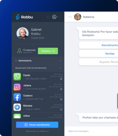 Deixe o improviso para trás. Com a Robbu, você ativa apenas os canais e recursos que fazem sentido para sua operação e escala com inteligência.
